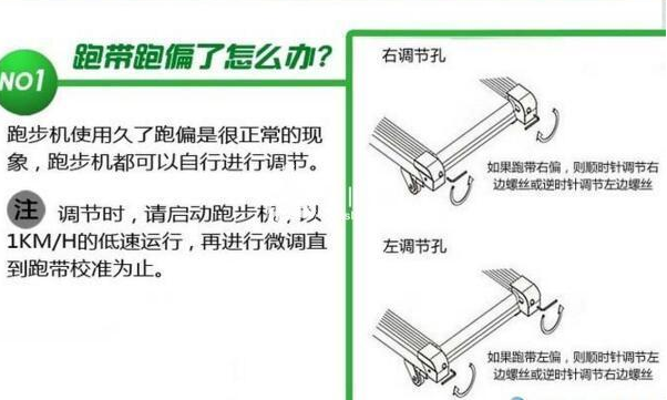 1.如果跑带偏向左偏时,可顺时针调节左边的后端盖调节螺丝,或逆时针调节右边的后端盖调节孔内调节螺丝。